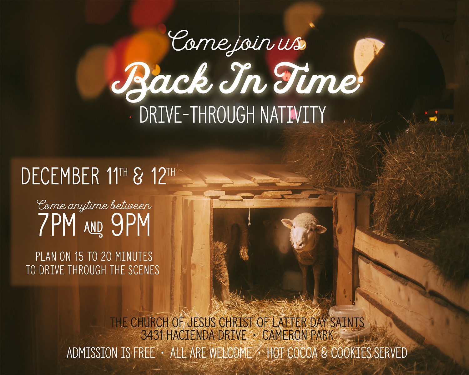 As you drive back in time, you'll be given cookie treats for the road ahead along with a link to listen to pre-recorded narration and music for each scene. Painted backdrops, live animals, bales of hay, and crackling fires help bring the scenes of Old Bethlehem to life.